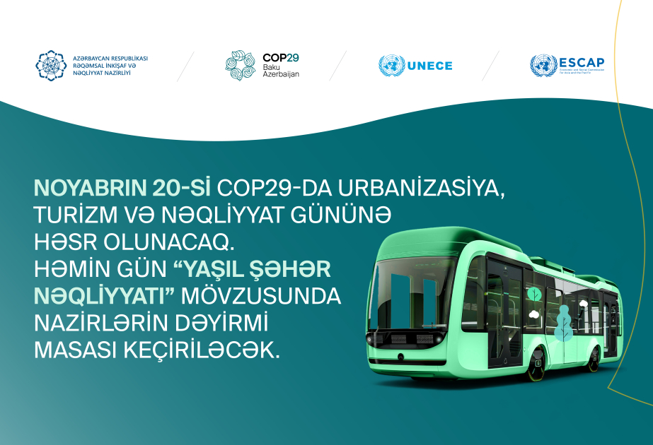 Noyabrın 20-də COP29 çərçivəsində Urbanizasiya, Turizm və Nəqliyyat Günü olacaq. Həmin gün “Yaşıl şəhər nəqliyyatı” mövzusunda nazirlərin dəyirmi masası keçiriləcək.