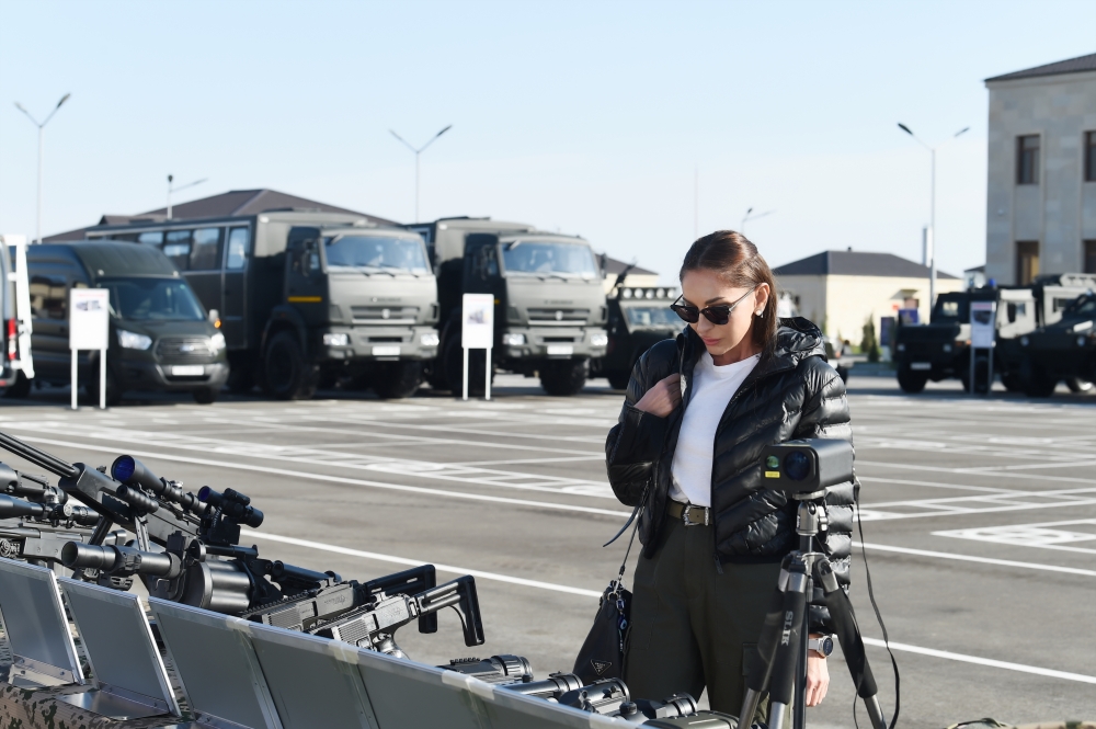 Затем Президент, Верховный главнокомандующий Ильхам Алиев посмотрел оружие, боеприпасы и военную технику, предназначенные для спецназовцев Внутренних войск.
