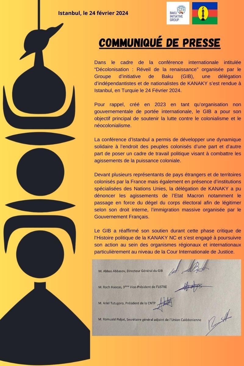 Qeyd olunub ki, Bakı Təşəbbüs Qrupu tərəfindən təşkil edilmiş tədbir çərçivəsində Kanaki - Yeni Kaledoniyanın müstəqillik tərəfdarları və millətçilərdən ibarət nümayəndə heyəti fevralın 24-də Türkiyənin İstanbul şəhərində toplaşıblar: “Xatırladaq ki, 2023-cü ildə beynəlxalq qeyri-hökumət təşkilatı kimi yaradılmış Bakı Təşəbbüs Qrupunun əsas məqsədi kolonializm və neokolonializmə qarşı mübarizəni dəstəkləməkdir”.